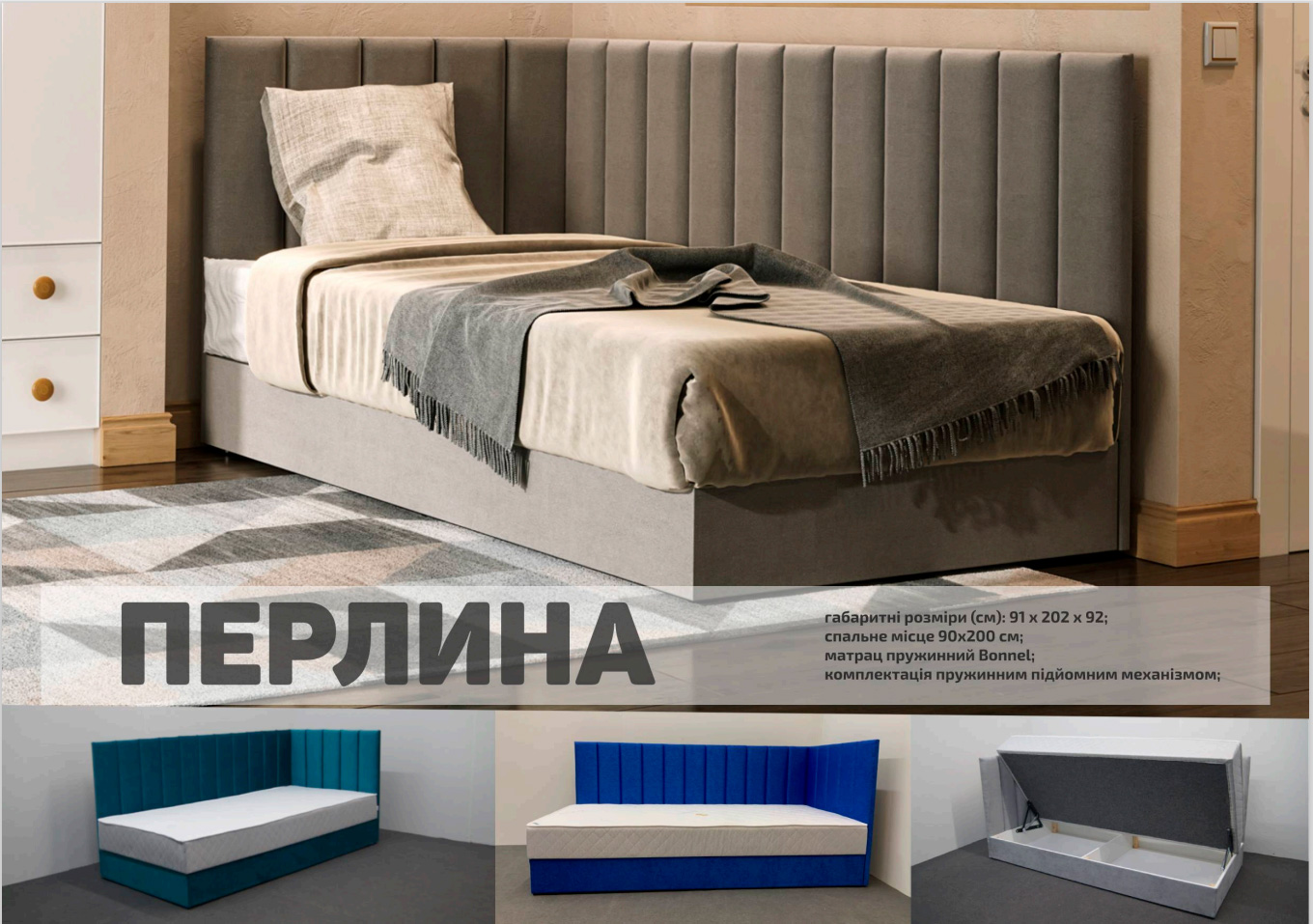 Оббивка ліжка виготовлена з високоякісних матеріалів, що пропонують широку палітру кольорів. Ви можете вибрати відтінок, який ідеально підійде Вашому інтер’єру та підкреслює Ваш особистий стиль. Незалежно від того, чи ви надаєте перевагу нейтральним тонам або яскравим акцентам, ліжко Перлина зможе задовольнити Ваші уподобання.