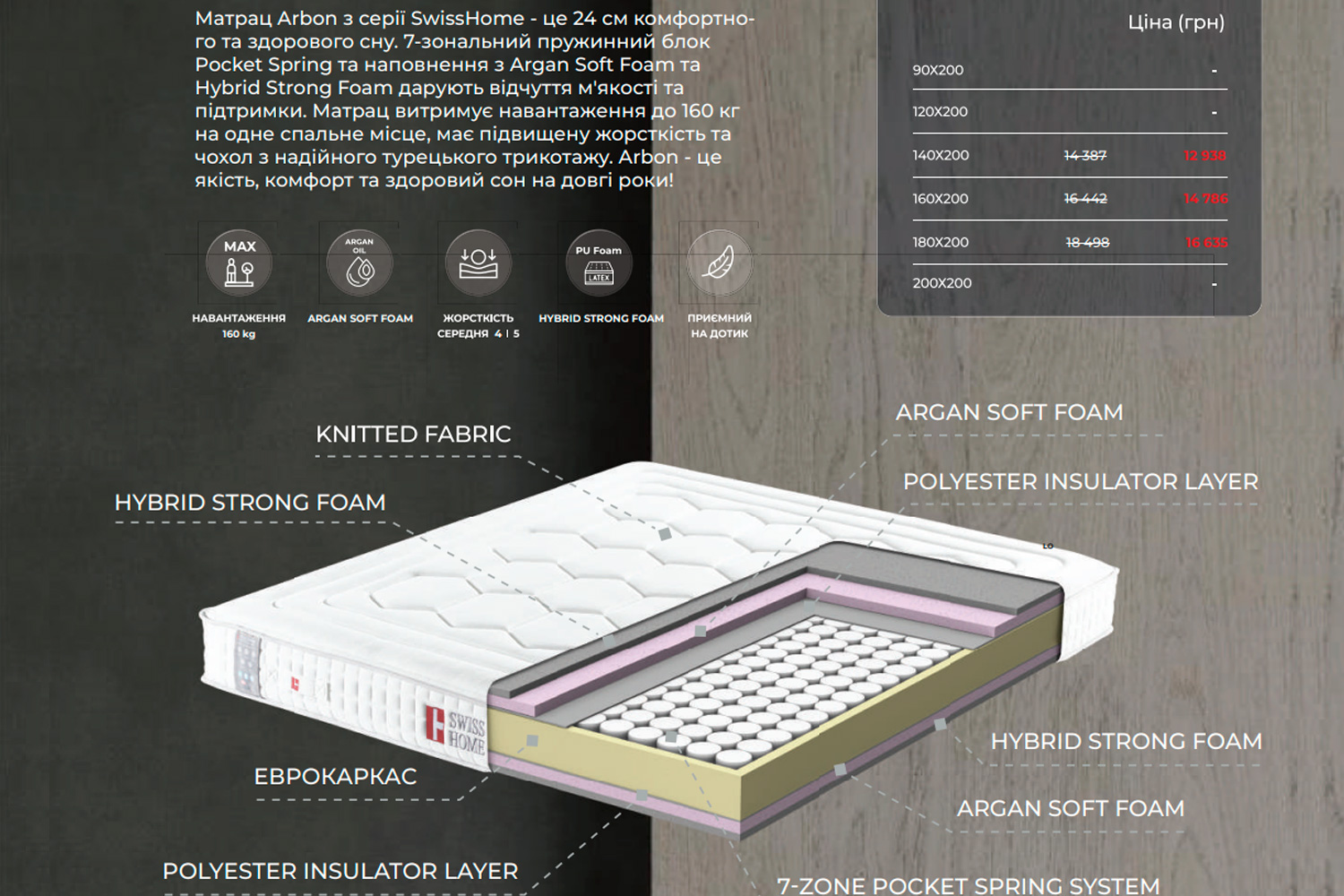 Завдяки використанню Argan Soft Foam та Hybrid Strong Foam, матрац Арбон забезпечує оптимальний рівень комфорту та підтримки. Ці матеріали адаптуються до форми Вашого тіла, знімаючи напругу з точок тиску та забезпечуючи максимальне розслаблення м’язів.